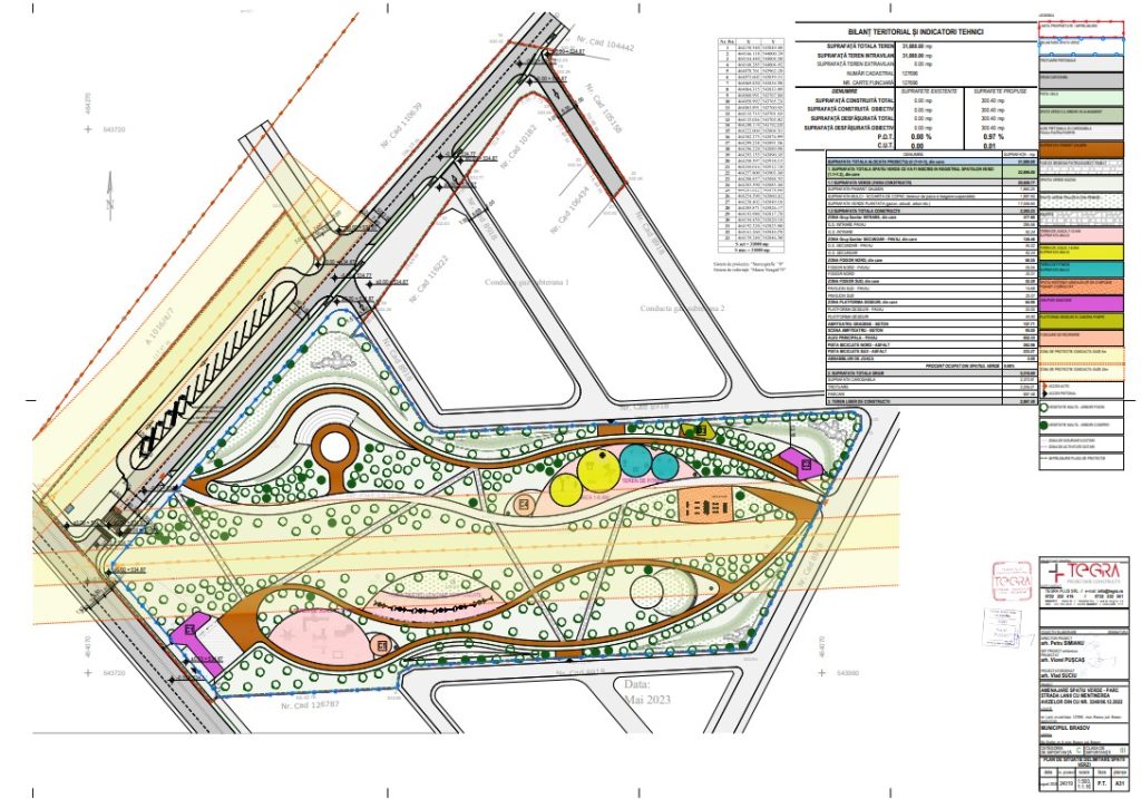 Zona verde va avea o suprafață de 20.610,77 mp, care va fi plantată cu gazon, arbori și arbuști și cu flori perene.