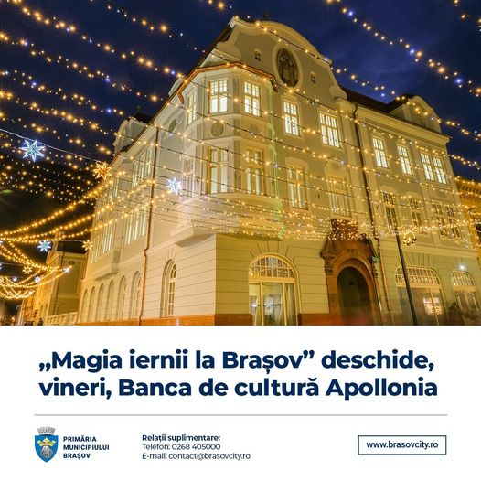 Banca de cultură Apollonia (fosta Bancă săsească) devine, din 16 decembrie, cel mai mare centru cultural din Brașov. Pentru a marca deschiderea imobilului recent renovat, Primăria Brașov, în parteneriat cu Filarmonica, organizează, în cadrul evenimentului ,,Magia iernii la Brașov”, în perioada 16 decembrie – 15 ianuarie, o serie de evenimente culturale pentru brașoveni și pentru cei care ne vizitează orașul.