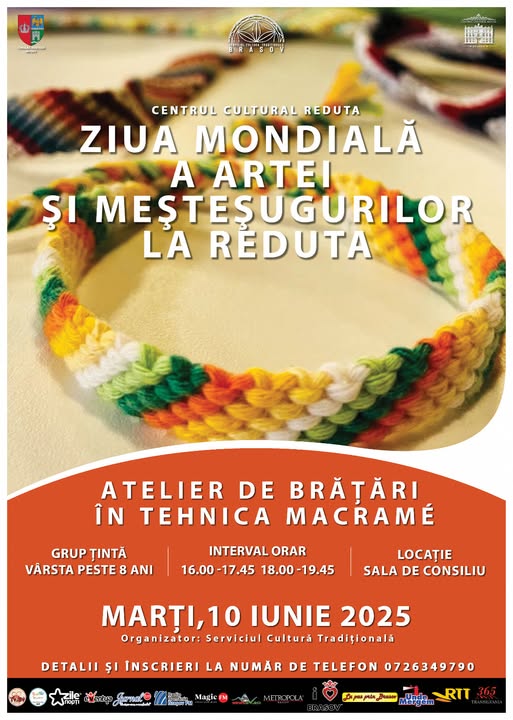 Centrul Cultural Reduta din Brașov marchează Ziua Mondială a Artei și Meșteșugurilor în data de 10 iunie 2025, printr-un eveniment creativ dedicat publicului de toate vârstele: un atelier de brățări realizate în tehnica macramé.